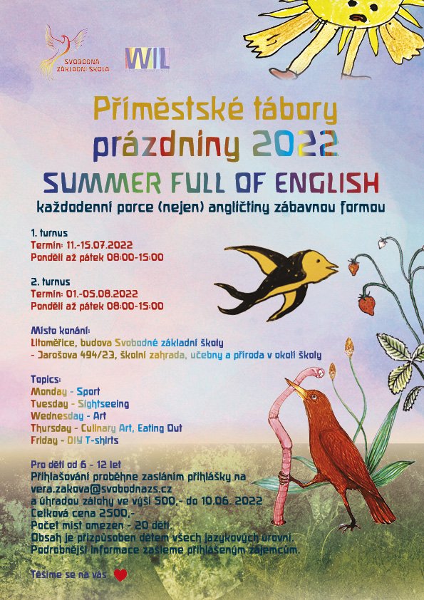 Přijměte prosím pozvání na další turnusy příměstských táborů. Tentokrát budou probíhat v Litoměřicích a zaměří se na zdokonalování angličtiny. Podrobnosti v přiloženém letáku. Těšíme se !